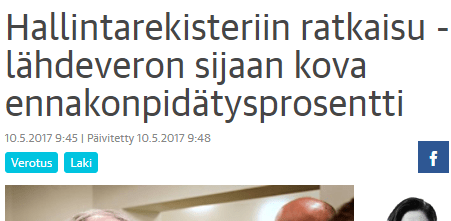 Hallitus lupasi toukokuussa puuttua hallintarekisterien aiheuttamaan verovilppiin rangaistusluonteisella 50 prosentin ennakonpidätyksellä. Valtiovarainministeriö laittoi lupailuja koskevan lakiluonnoksen lausuntokierrokselle kesäkuun lopussa. Hallituksen ehdotukset ovat muuttuneet jälleen uuteen muotoon. Ne ovat kuitenkin kaukana täydellisestä.